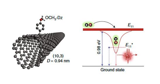 image: Depiction of a carbon nanotube defect site generated by functionalization of a nanotube with a simple organic molecule. Altering the electronic structure at the defect enables room-temperature single photon emission at telecom wavelengths.