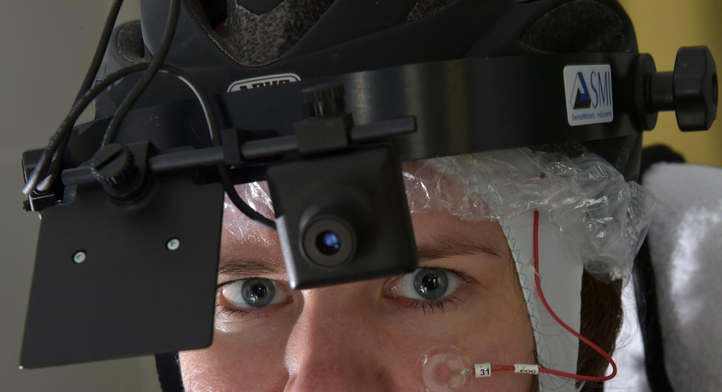 image: The psychologist Dr Barbara Schmidt with bicycle helmet, on which an eyetracker is mounted.