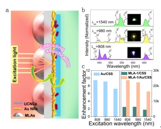 image: a, Schematic illustration of the cascading amplification strategy for UCNCs. b, UC emission spectra of CSS UCNCs recorded under 808, 980 and 1540 nm laser excitation, respectively. (Inset) Corresponding photos of the CSS UCNCs films upon illumination of three kinds of lasers. c, Enhancement factors for Au NRs/CSS, MLA-1/CSS, MLA-1/Au NRs/CSS composites under separately 808, 980, and 1540 nm excitation.