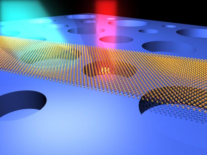 image: Illustration of ultrasensitive optical interrogation of the motions of atomically thin drumhead nanoelectromechanical resonators (made of atomic layers of MoS2 semiconductor crystals).