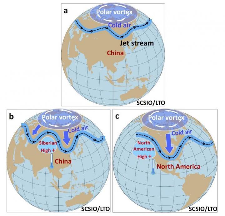 Regarding the extremely cold surges during the 2020/21 winter, Prof. Wang's team points to the Siberian High. An enhancement and northward movement of the Siberian High force the jet stream to develop a wavy pattern. This disrupts the polar vortex, allowing cold polar air to invade southward, thus inducing the cold surges in China (Fig. 1b) and North America (Fig. 1c).
