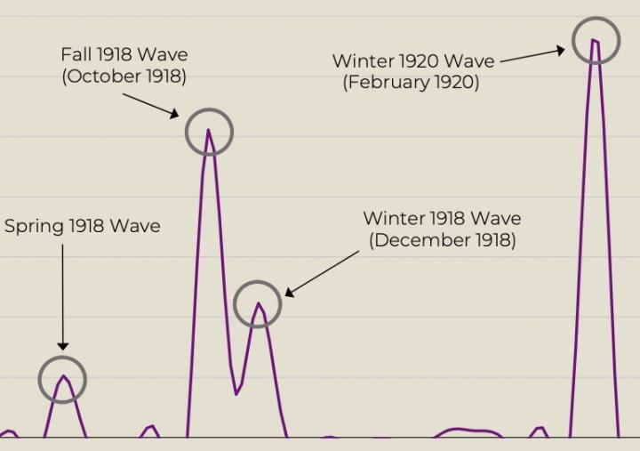 Using influenza infection and mortality data on Michigan from 1918-1920, Chandra identified four distinct waves. The first large peak was in March 1918. "After a second spike in cases in October 1918, the governor instituted a statewide ban on public gatherings," Chandra said. "Much like the restrictions that were put in place during the COVID-19 pandemic."