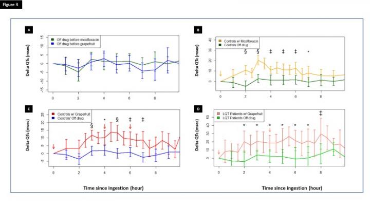 image: These four graphs show deviations of the QTc from baseline during different study days with different interventions. The horizontal axis shows the time (in hours) starting after the third baseline ECG. The vertical axis represents changes in QTc (either prolongation or shortening) from baseline (or delta QTc) following a given intervention. The yellow arrow denotes the timing of administration of oral moxifloxacin after the third baseline electrocardiogram and the pink and red arrows denote repeated administration of grapefruit juice. Panel A compares the delta-QTc during the off-drug day before moxifloxacin (in green) and during the off-drug day before grapefruit (in blue). Note that the two graphs are similar, never reaching a statistically significant difference. Panels B and C show the delta QTc among healthy volunteers after receiving moxifloxacin (yellow line) or grapefruit (red line) and the delta QTc during their respective off-drug study day. Panel D shows the delta QTc of long-QT patients after drinking grapefruit (pink line) and during the off-drug day (light green).
