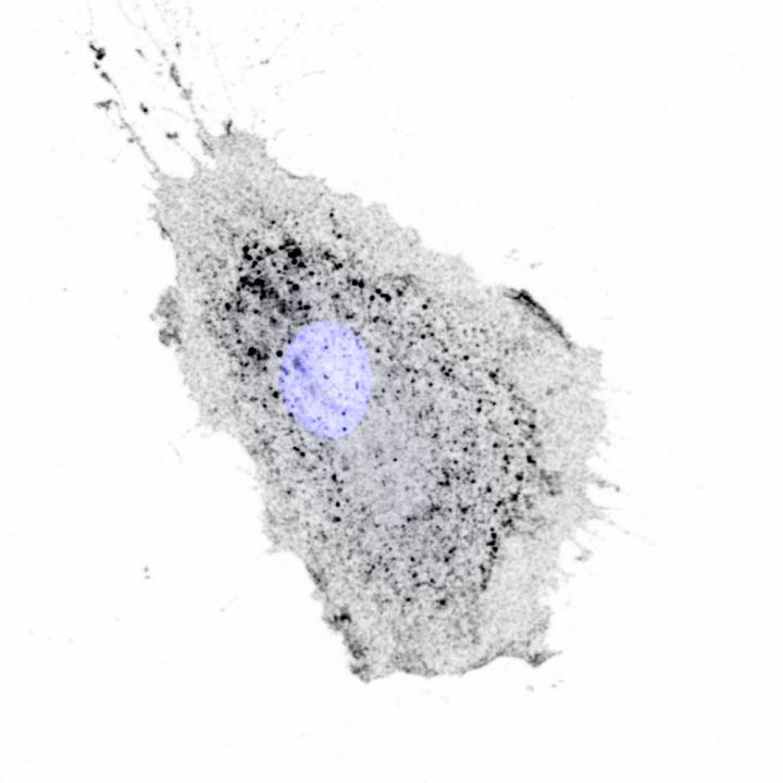 image: Integrins being moved inside a migrating cell. Integrins appear as dark spots, cell nucleus is blue.