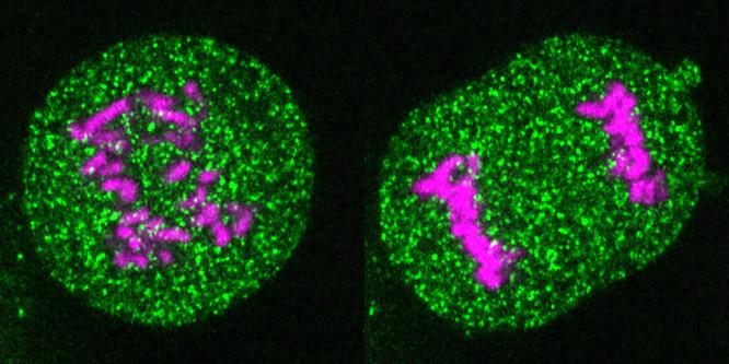 image: Images of a live HeLa cell expressing fluorescent GEM particles (green) to probe the localization of large cytoplasmic components during cell division. Chromosomes are fluorescently labelled in magenta. During early stages of mitotic exit (image on the left side), chromosomes are still far apart, and GEM particles localize throughout the cell and also in spaces between chromosomes. Later in mitosis, as the chromosomes move towards the cell poles, they come together to form a dense cluster (image on the right side). During this clustering process, the GEM particles are excluded from the space between chromosomes. The nuclear envelope, which subsequently wraps around chromosomes then does not incorporate cytoplasmic GEMs and potentially other cytoplasmic contaminants.