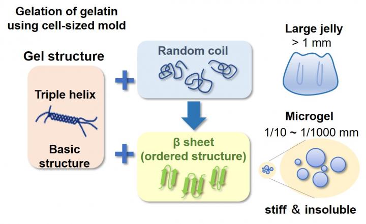 Through analysis of size dependence on elasticity of gelatin microgels formed inside cell-mimicked small mold (1/10th to 1/1000th of a millimeter), they discovered that Cell-sized mold makes gelatin gels 10 times stiffer. Detailed analysis of molecular structure in the gelatin microgels revealed that increase of β sheet from interaction with lipid membrane covering the cell-mimicked mold is the factor for the higher stiffness.