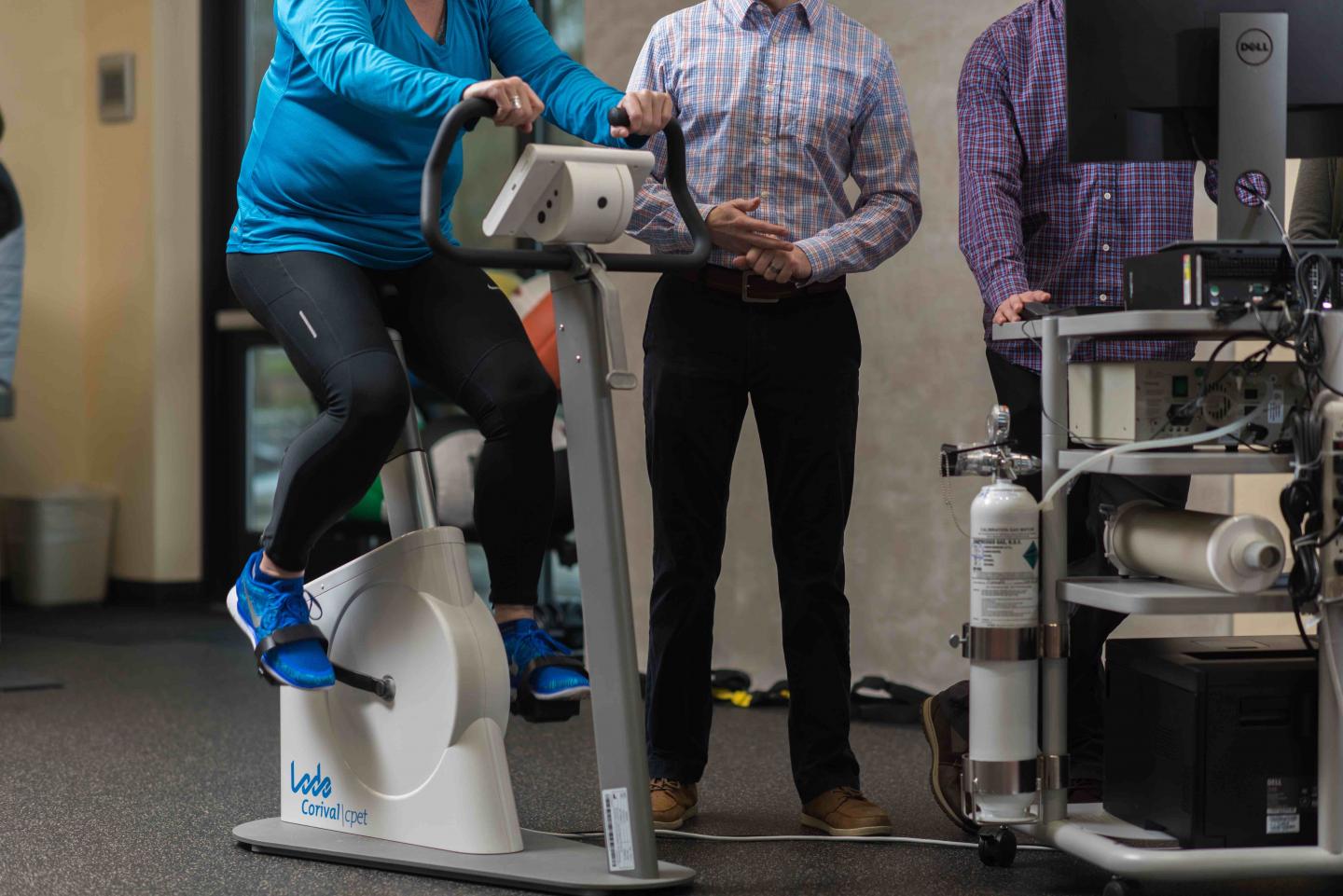 image: A woman rides an exercise bike while her activity level is monitored in the Translational Metabolic Research Laboratory at Oregon State University.
