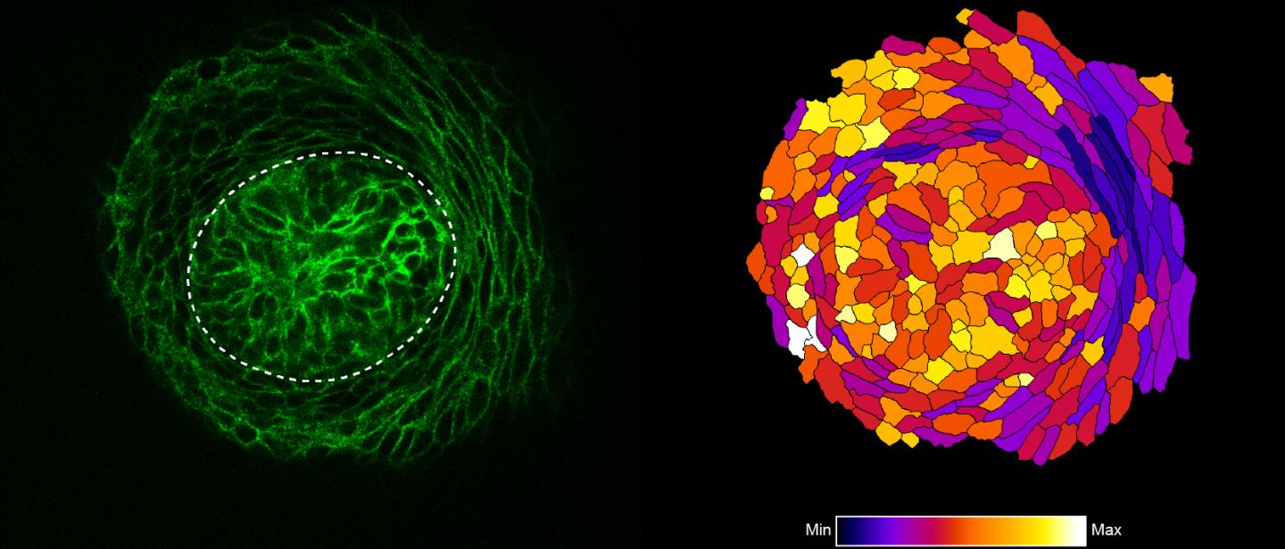 image: Optical section of a confocal microscopy image of the mammary bud (marked with dashed line) stained with an epithelial marker in green at the time when ring cells form (left) and analysis of cell roundness of segmented cells with ring cells in dark blue (right).