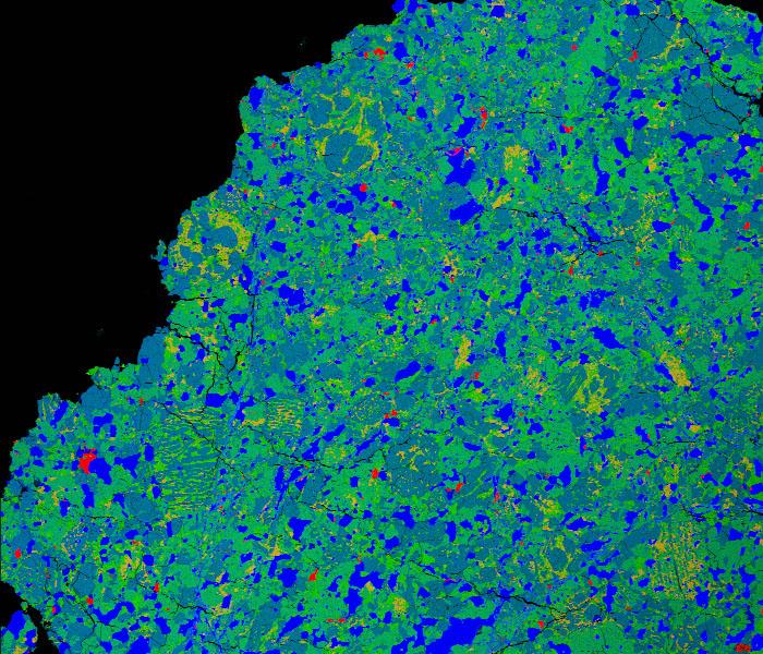 image: An elemental X-ray map of a portion of the Peekskill meteorite. Different colors correspond to different elements.