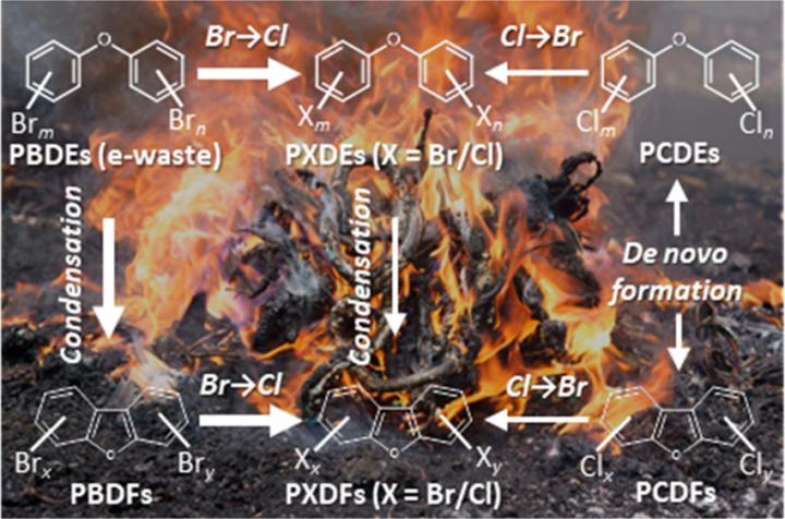 image: Formation of brominated, chlorinated and mixed halogenated diphenyl ethers and dibenzofurans during e-waste burning.