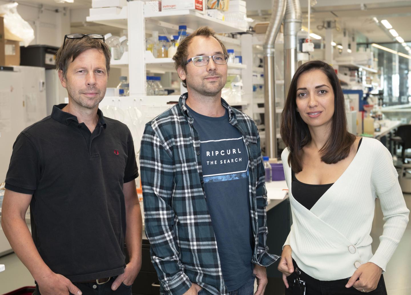 image: Co-first authors Ioanna Smyrlaki (right) and Anders Ekman (left) and Bjorn Reinius, principal investigator of the study.