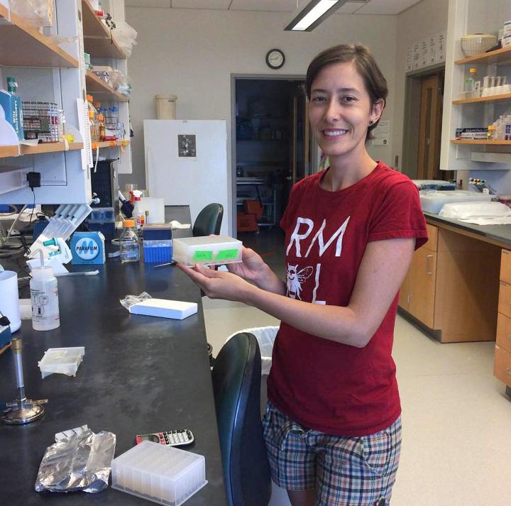 image: Postdoctoral researcher Mayra Vidal with a tray containing a harvested community of yeast.
