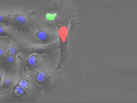 image: The image shows in a HBV-specific T cell (green) attacking a target cell, in which viral proteins are produced (red) and HBV negative cells (blue).