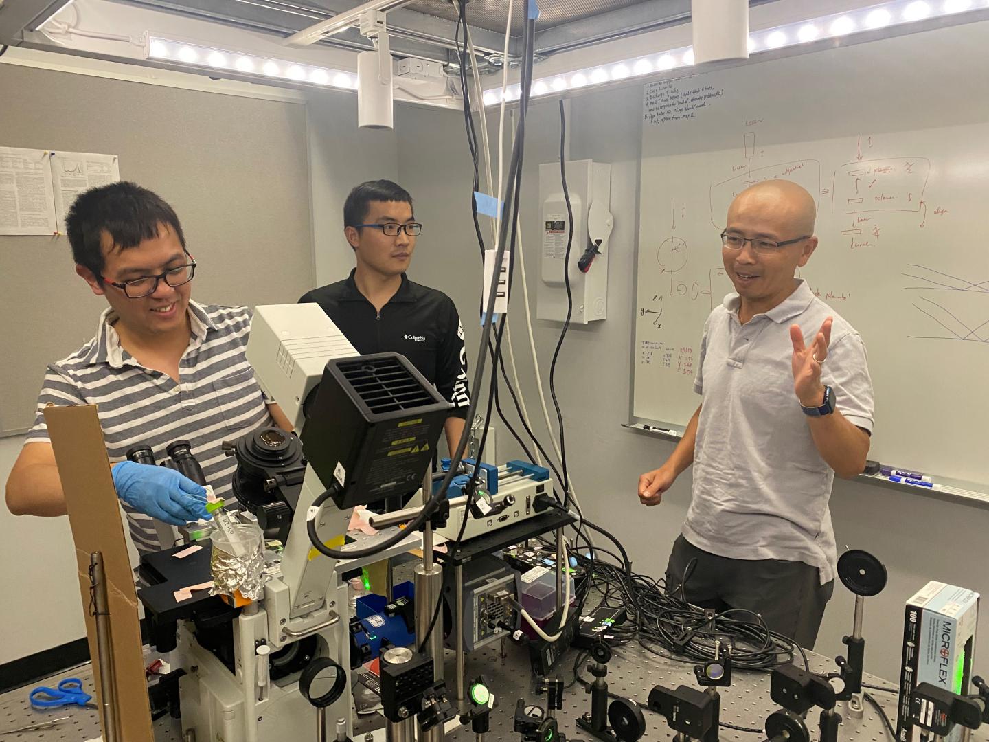 image: Dr. Rong Ye (left), Dr. Ming Zhao (center), and Dr. Peng Cheng (right) at Cornell discuss their Army-funded research that identifies a new chemistry approach that could remove micropollutants from the environment.