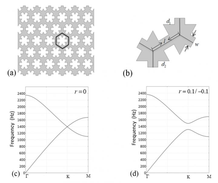 image: (a, b) Schematics and parameters of the sonic crystal. (c, d) The band structures of the sonic crystal with r=0 (c) and r=0.1/-0.1 (d), respectively.