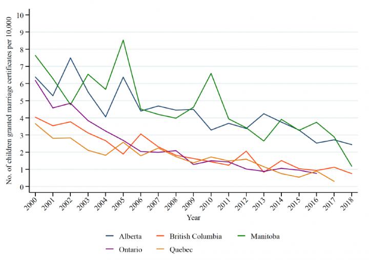 Using data from vital statistics agencies and recent censuses, the researchers found that child marriage remains in practice from coast to coast, with the highest estimates of formal marriage found in Alberta (0.03%) and Manitoba (0.04%), and the highest estimates of any type of child marriage (formal or common-law) in Saskatchewan (0.5%) and the territories (1.7%). The study, published in Population and Development Review, is the first to shed light on how common child marriages are in the country.