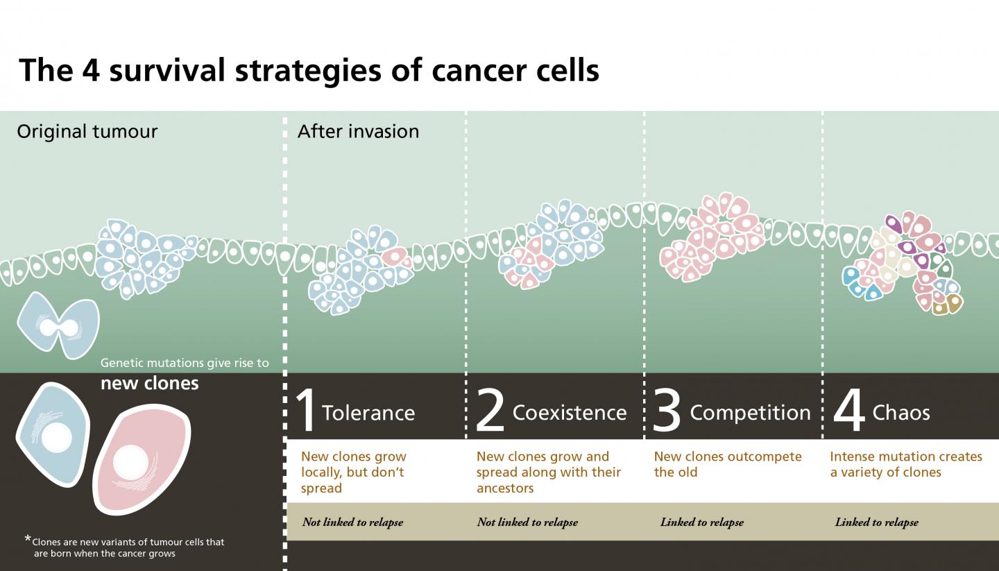A new clone outcompetes the original tumour cell, and then builds up parts of the tumour entirely on its own. The researchers found that this strategy was associated with increased risk of relapse.