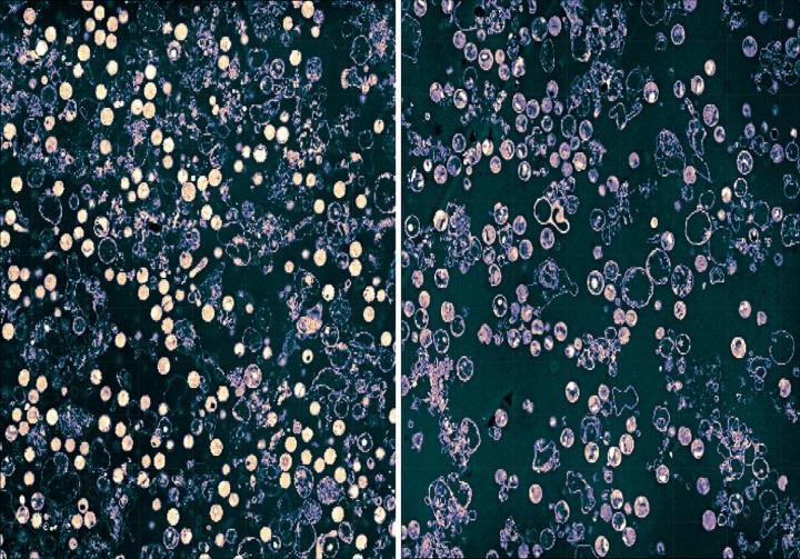 image: Resting Chlamydia (left; bright circles), which are held without glutamine. After the addition of glutamine (right) the bacteria enter the division stages (darker circles).