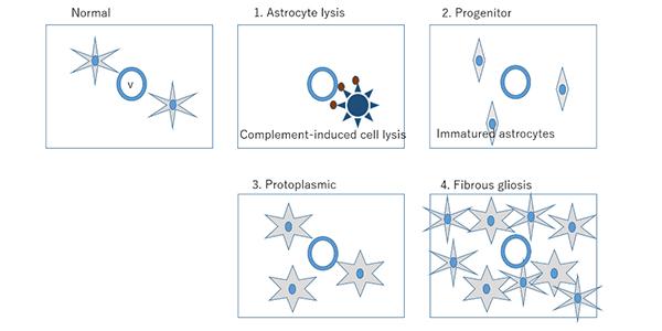 This astrocyte degeneration comes in four main types that the researchers have named astrocyte lysis, progenitor, protoplasmic gliosis, and fibrous astrogliosis, each with their own set of characteristic markers identifiable from astrocyte lesions, or damage to the astrocytes. Astrocyte lysis, or extensive loss or complete destruction of astrocytes, a characteristic of the most acute type of such damage (meaning sudden onset and short duration), is a feature highly specific to NMOSD. The other three types describe subacute or chronic forms of the disease (meaning slow onset that can worsen over time).