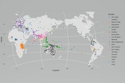 image: Global distribution of languages included in the CLICS3 release, identified by language family.