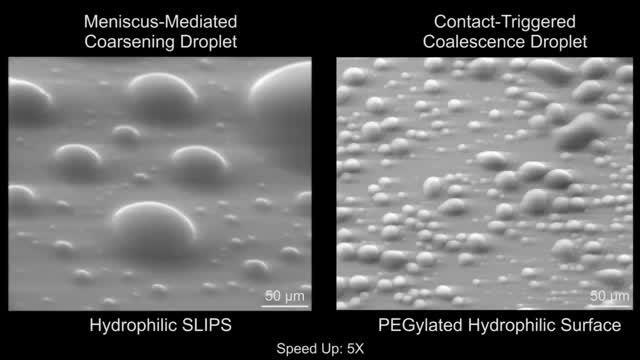 Microdroplets of water on a hydrophilic SLIPS surface (left) propel themselves to climb, without external force, into larger droplets along an oily, ramp-shaped meniscus that forms from the lubricant around the larger droplets. On the right, the video clip shows how microdroplets behave on a solid slippery surface.