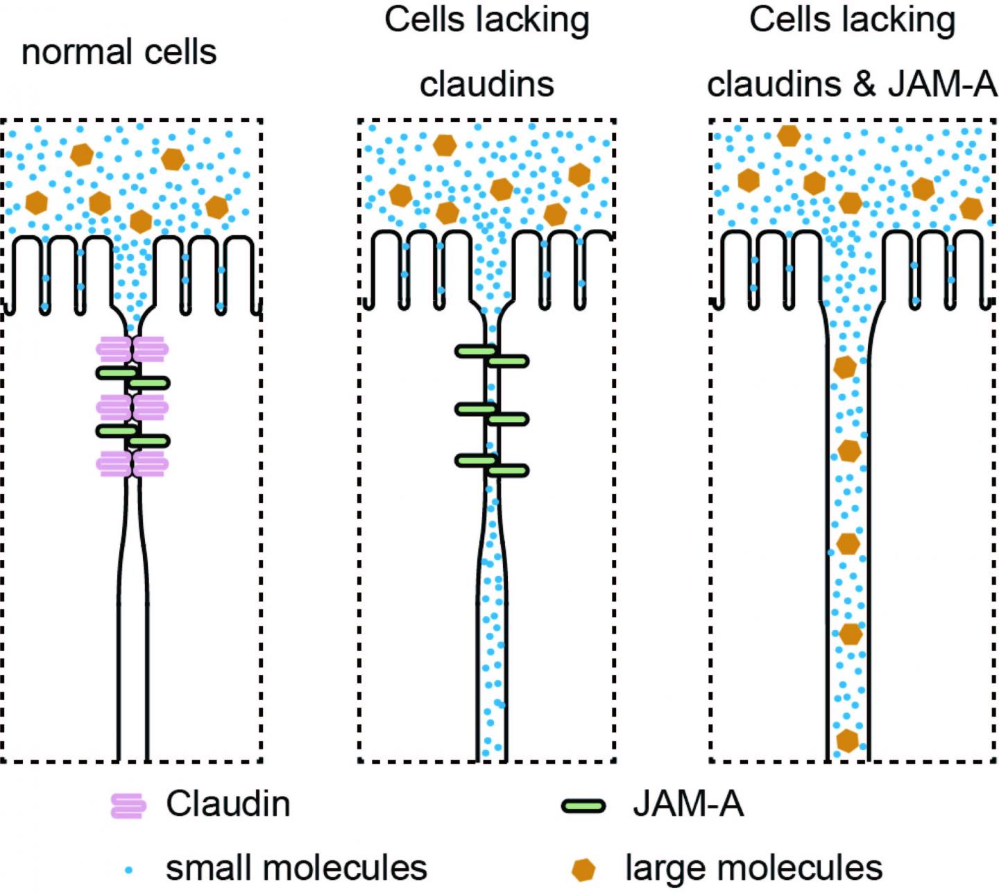 image: Tight junctions seal the gaps between neighboring cells to form epithelial barrier. In epithelial cells lacking claudins, the barrier against small molecules is disrupted but the barrier against large molecules is still maintained. In epithelial cells lacking both claudins and JAM-A, the space between neighboring cells is widened, and the barrier against small and large molecules is disrupted.