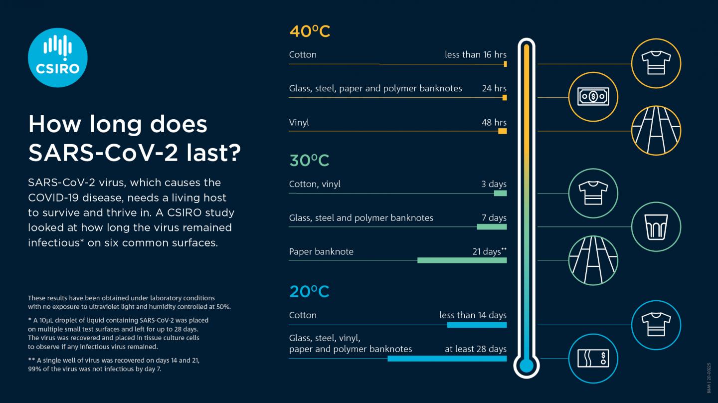 Researchers at CSIRO, Australia's national science agency, have found that SARS-CoV-2, the virus responsible for COVID-19, can survive for up to 28 days on common surfaces including banknotes, glass - such as that found on mobile phone screens - and stainless steel.