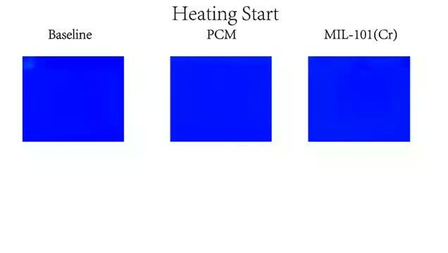 The team selected a type of MOFs called MIL-101(Cr) for the experiment because of its good water-absorbing capacity and high sensitivity to temperature changes. They coated three 16-square-centimeter aluminum sheets with MIL-101(Cr) of different thicknesses--198, 313, and 516 micrometers, respectively--and heated the them on a hot plate.