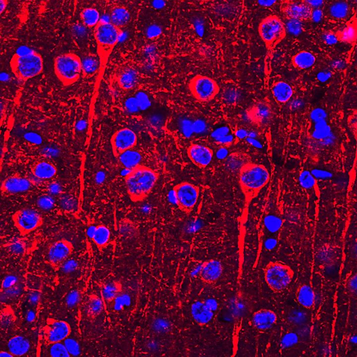 image: Neurofibrillary tau tangles (stained red) are one of the two major brain lesions of Alzheimer's disease. Blue fluorescent stain (DAPI) depicts the nerve cell nuclei.