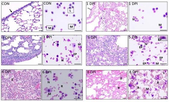 image: These findings provide important clues regarding the inflammatory cellular signature at different time intervals during severe influenza infection. Temporal dynamics in hematoxylin and eosin-stained lung sections or modified Geimsa-stained bronchoalveolar lavage cells from control and lethal influenza-challenged mice were evaluated at 1, 3, 5, 6, and 8 dpi. Initial epithelial cytopathic effects were prominently seen at 1 dpi (open arrow), which spread to alveoli and were followed by the severe inflammatory phase (3-5 dpi). By 6 dpi, significant vascular leakage and collapse of the alveoli became prominent, and animals died between 8-9 dpi with severe hemorrhagic exudates (hash) with abundant proteinaceous material in the alveolar spaces (asterisk). CON-Control; DPI-Days post infection; M-macrophage; L-lymphocyte; N-neutrophil, EP-epithelial cell. Representative image was selected from 5 mice per group.