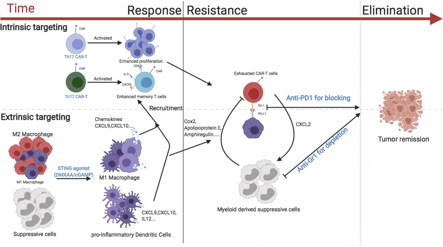 “cGAMP is in clinical trials for the treatment of patients with cancer, there are multiple ongoing clinical trials using approaches to inhibit immunosuppressive cells for patients with malignant disease, and there are clinical trials currently evaluating the combination of CAR T cells with immune checkpoint blockade,” Serody says. “Together therefore, our data suggest a viable strategy for boosting CAR T activity in solid tumors.”