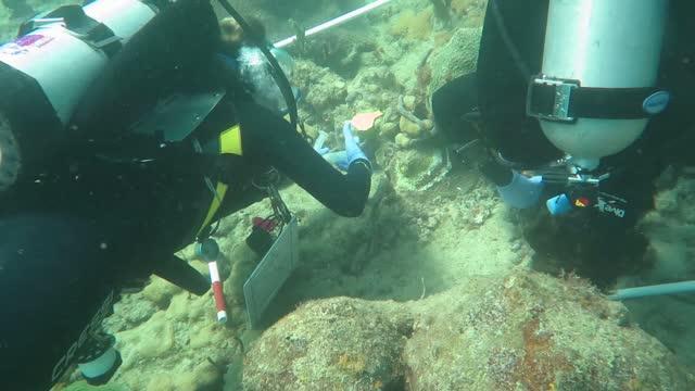 video: FAU scientific divers Erin Shilling and Ryan Eckert are shown applying the antibiotic treatment (the white paste) into trenches created around disease lesions present at the edges of the coral colony. The trenches are the white inner margin on the coral tissue (the white is just exposed coral skeleton), while the lesions are the pale/white tissue at the edge of the coral colony. Shilling and Eckert then apply the same treatment to a smaller coral in the same manner. Later, they again treat a coral, however, it is with chlorinated epoxy (brown paste) being packed into both the trench created on the colony as well as over the lesions themselves.