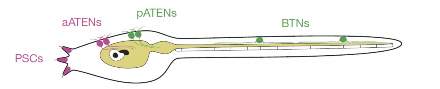 The researchers found that the antero-posterior compartmentalization of the Ciona lateral plate led to the development of related but distinct sensory cell types, including palp sensory cells (PSCs), anterior trunk epidermal neurons (aATENs) and bipolar tail neurons (BTNs). aATENS have been shown to have dual properties of placode-derived chemosensory neurons, such as neurons involved in the sense of smell, while BTNs are thought to share properties with neural crest-derived dorsal root ganglia, a cluster of neurons (a ganglion) in a dorsal root of a spinal nerve.