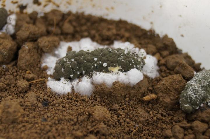 image: Penn State researchers knew the Metarhizium robertsii fungus was deadly to insects such as caterpillars on the ground (victim shown here), but they became more interested when they learned it was taken up by plant roots. Turns out, the fungus boosts both plant growth and plant defenses against pests.