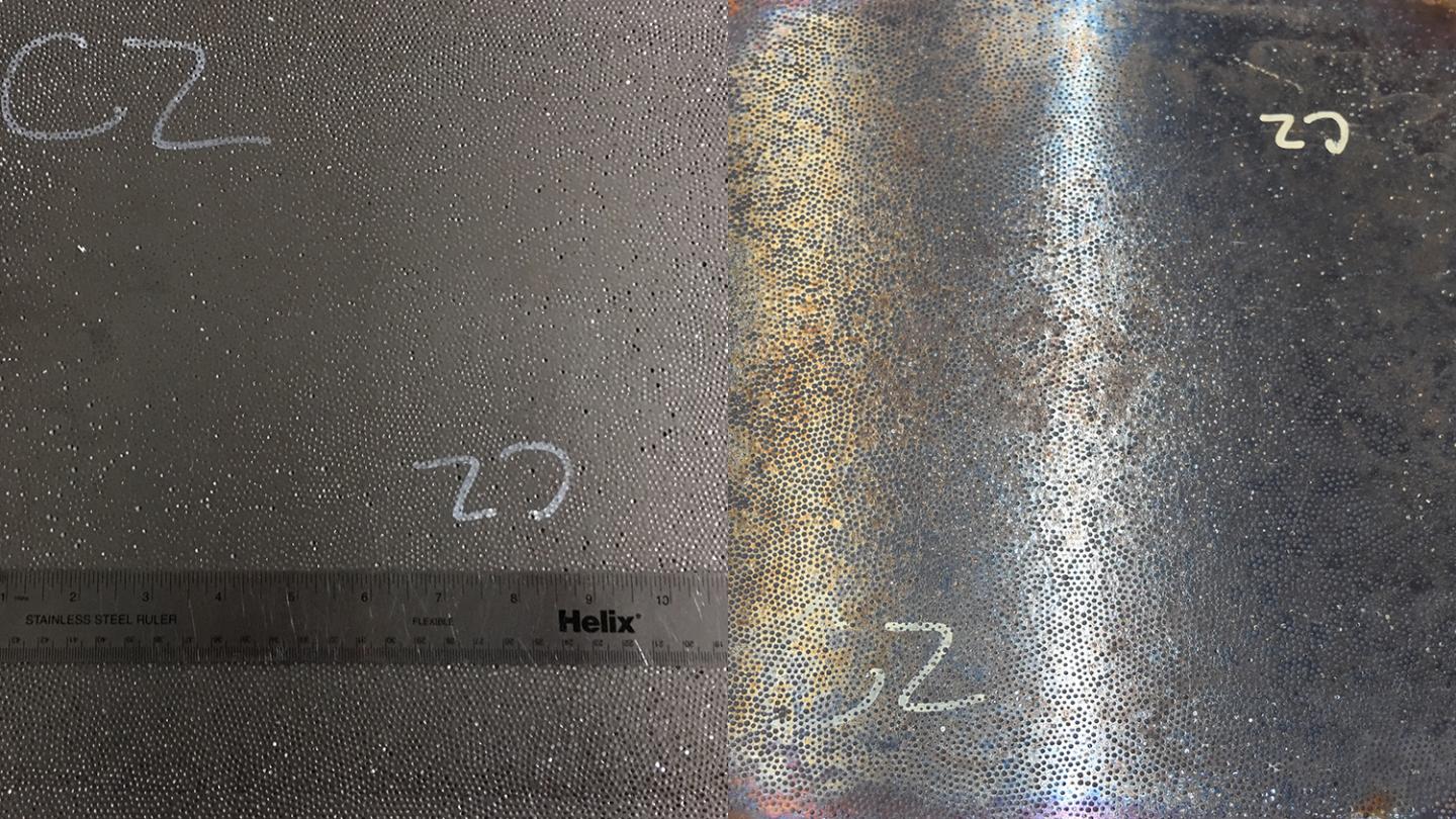 image: This image shows steel-steel composite metal foam samples before testing (right) and after 100 minutes exposure to 825C (left).