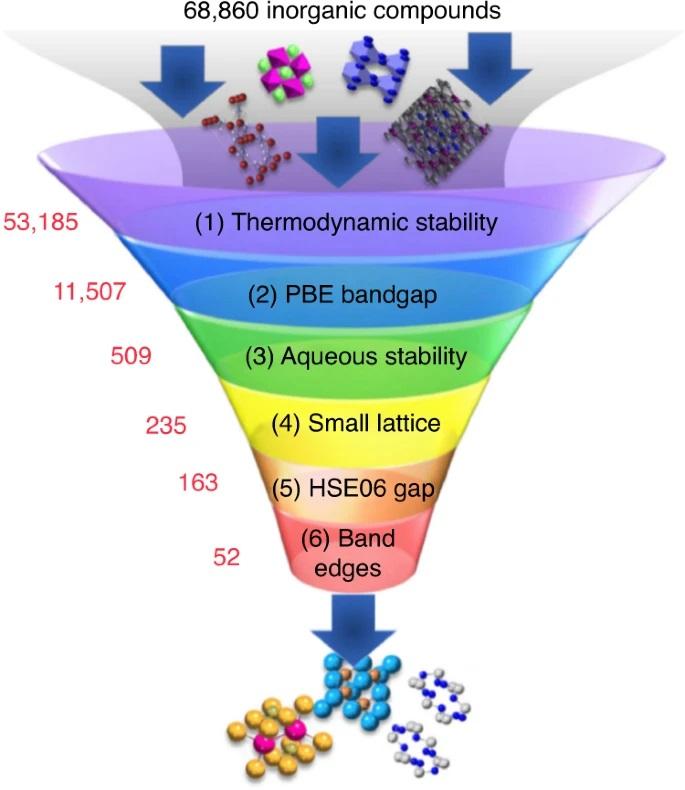 image: A large number of candidate materials are chosen from experimental or computational databases, and a sequence of screening calculations reduces their number down to a small set of candidates with the most promising properties.