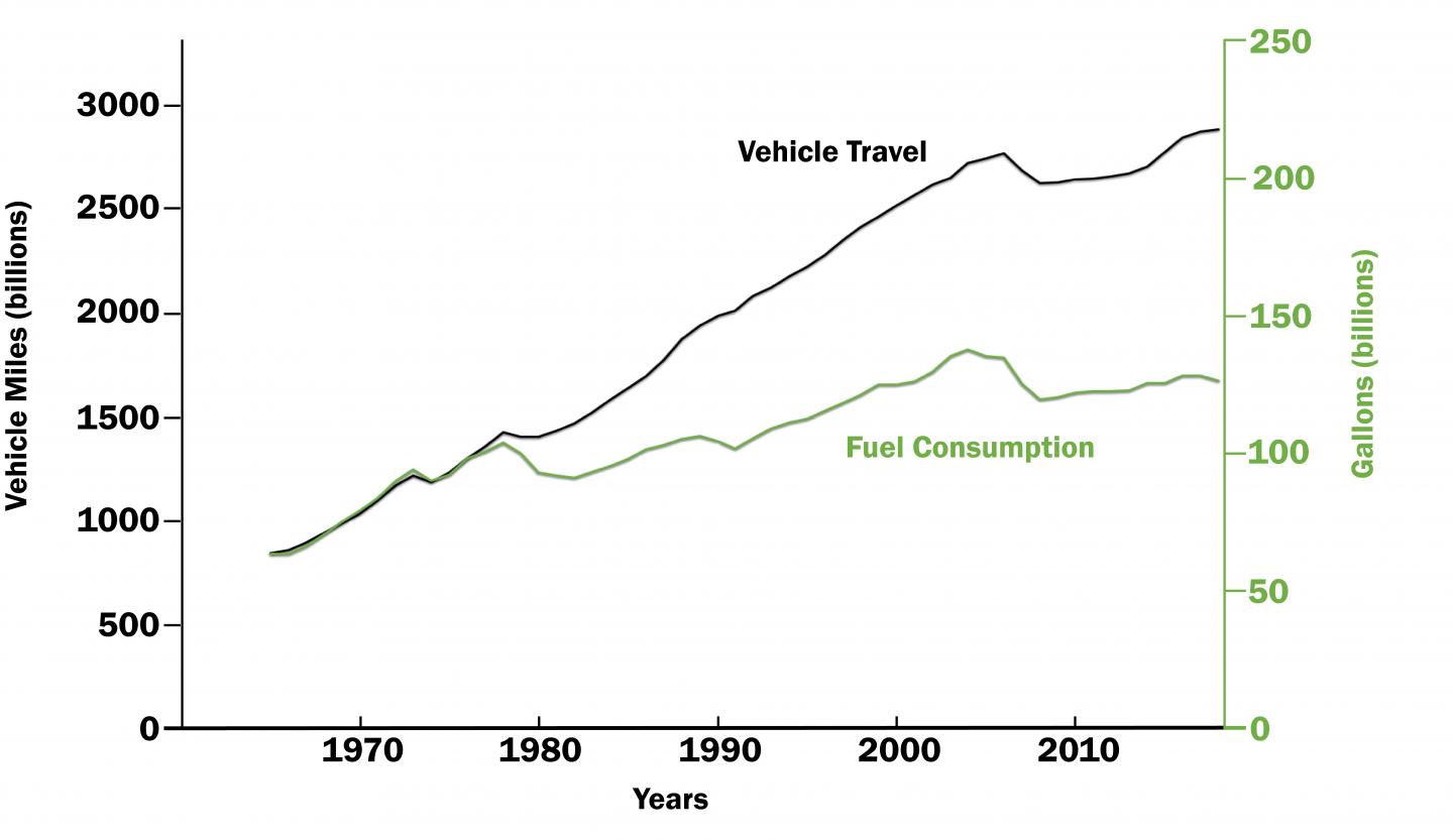 image: The graph shows vehicle miles traveled versus fuel consumption from 1965 through 2018 in the United States. While travel increased significantly during that time, fuel use dropped due, in large part, to the fuel economy standards and the fuel efficiency technologies that were developed and implemented to meet the standards.