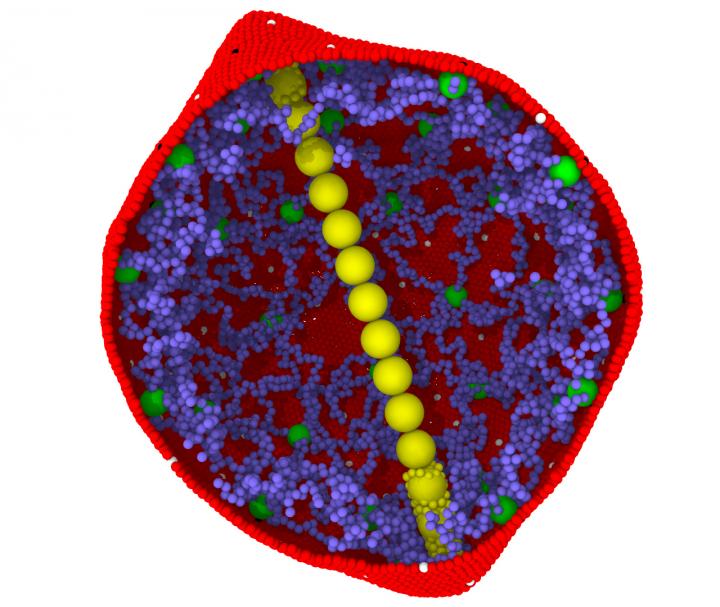 image: In sickle cell disease, long polymer fibers that form inside red blood cells can push the cells out of shape. A computer model developed by Brown University researchers simulates the processes and could help in testing new drugs to treat it.