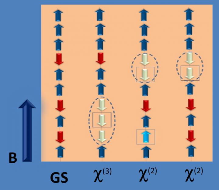 image: In the ground state the magnetic moments are either upward or downward, the spins antiparallel to the external magnetic field (red) are never together (right). By excitation, further spins can align antiparallel and Bethe chains are formed (white spins, left).