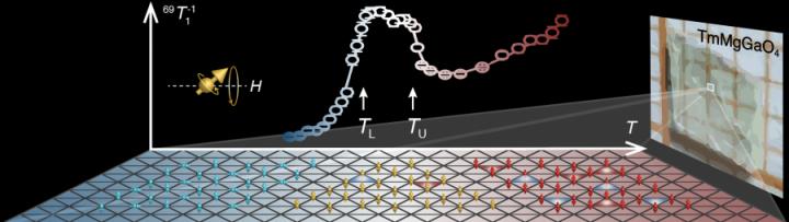 To detect such interesting KT phase in a magnetic material is not easy, as usually the 3-dimensional coupling would render magnetic material to develop ordered phase but not topological phase at low temperature, and even if there exists a temperature window for the KT phase, highly sensitive measurement technique is required to be able to pick up the unique fluctuation pattern of the topological phase, and that is the reason why such phase has been enthusiastically perused, but its experimental discovery has defied many previous attempts. After some initial failures, the team member discovered that the NMR method under in-plane magnetic fields, do not disturb the low-energy electronic states as the in-plane moment in TMGO is mostly multipolar with little interference on magnetic field and intrinsic magnetic moments of the material, which consequently allows the intricated topological KT fluctuations in the phase to be detected sensitively.