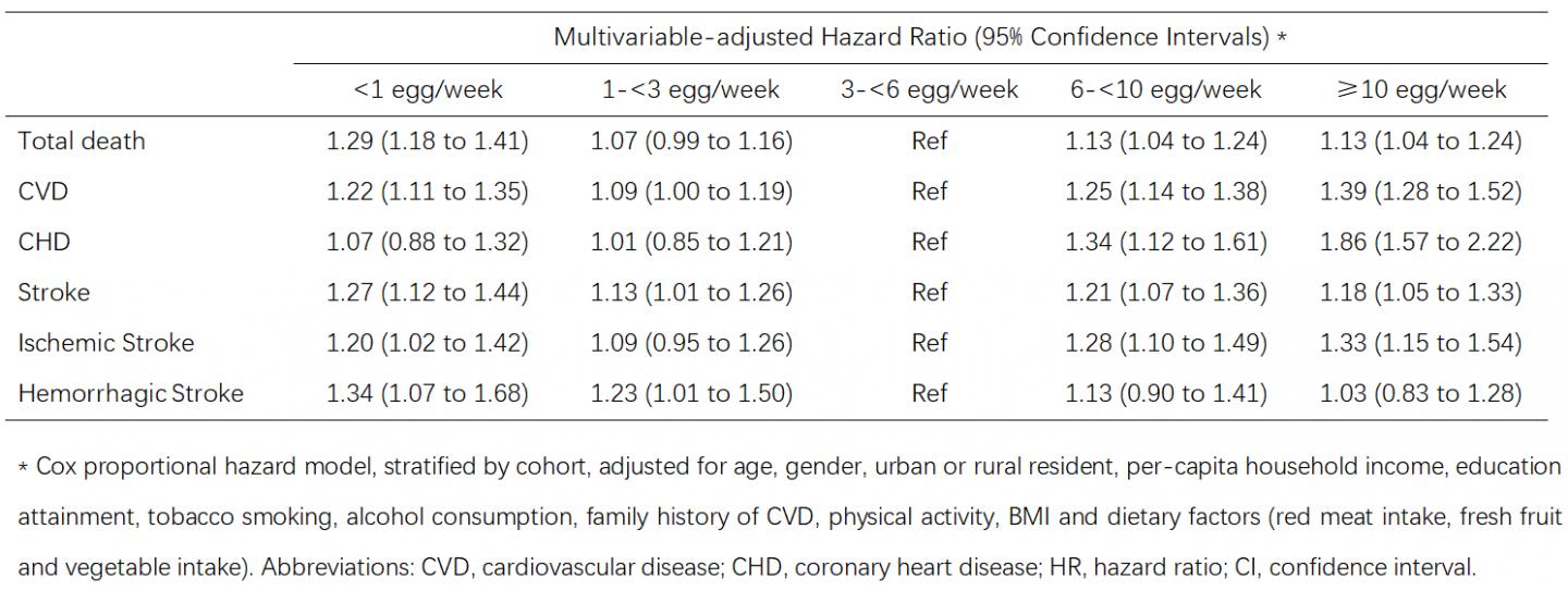 Eggs have been acknowledged as a good source of high-quality proteins and contain bioactive components beneficial for health, while they are also loaded with abundant cholesterol in the yolks, making the public hesitant about consuming whole eggs. Up to now, most studies exploring the association of egg consumption with incident CVD or total death were conducted in high-income countries and findings were inconsistent across populations and CVD subtypes. Accordingly, no consensus has been reached on the recommendation of egg consumption around the world.