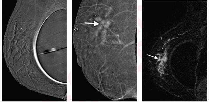 image: Left to right: Subtraction right mediolateral oblique (MLO) CEM was non-diagnostic because of artifact, potentially due to motion misregistration from extended exposure time; subtraction right MLO implant displaced CEM image shows 5.8 cm enhancing mass (arrow); contrast-enhanced MRI sagittal subtraction image shows concordant mass (arrow).