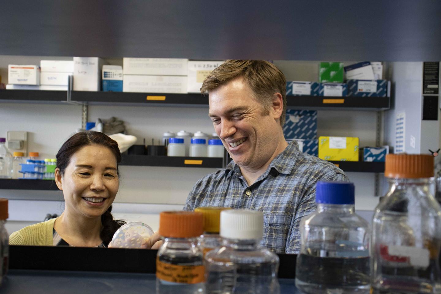 image: From left: Senior Research Scientist Xiangxia Luo and Andrew Capaldi, associate professor of molecular and cellular biology, examine cell lines they built that allow them to turn the TOR and PKA pathways on and off using drugs.