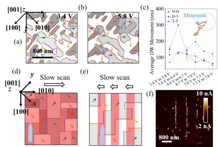 Under lower voltages, head-to-tail DWs are more mobile than other DWs, while under higher voltages, tail-to-tail DWs become rather active and possess relatively long average length. This is attributed to the high nucleation energy and relative low growth energy for charged DWs. Based on these results, researchers designed a two-step poling approach. They polarize ferroelectric thin films with lower and higher electric field by scanning the surface of the sample with the atomic force microscopy tip. Arrays of well-aligned stripe tail-to-tail DWs are successfully produced as conductive paths, while the orientation of DWs could be changed by varying the scanning direction of the tip. In this way, they achieved the oriented growth and configuration control of ferroelectric DWs.