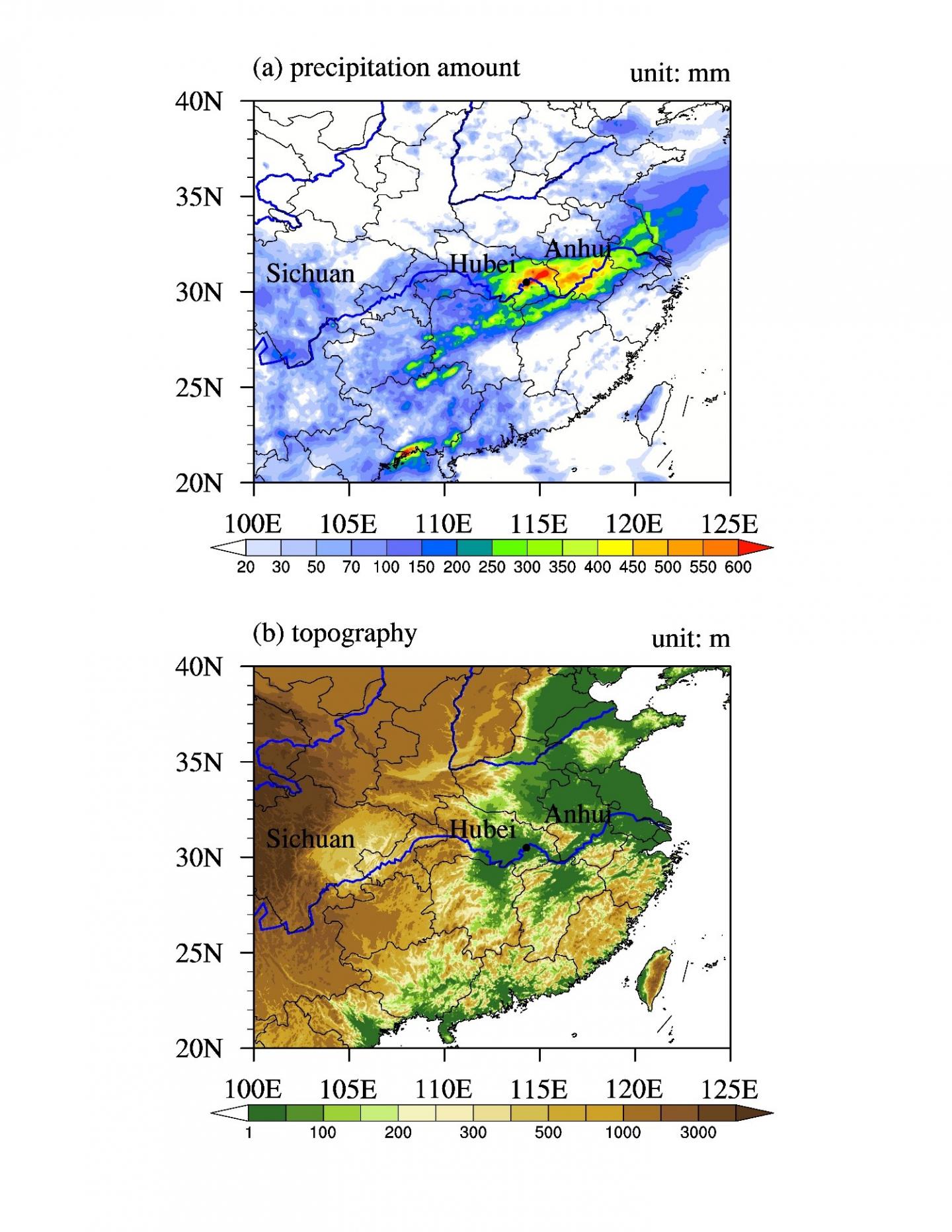 image: (a) Accumulated rainfall amount (unit: mm) from 30th June to 6th July, 2016. (b) Topography distribution (unit: m) over eastern China. Here the text "Sichuan", "Hubei" and "Anhui" indicates the location of Sichuan, Hubei and Anhui province, respectively. The black dot in (a) and (b) indicates Wuhan city, the provincial capital of Hubei province.