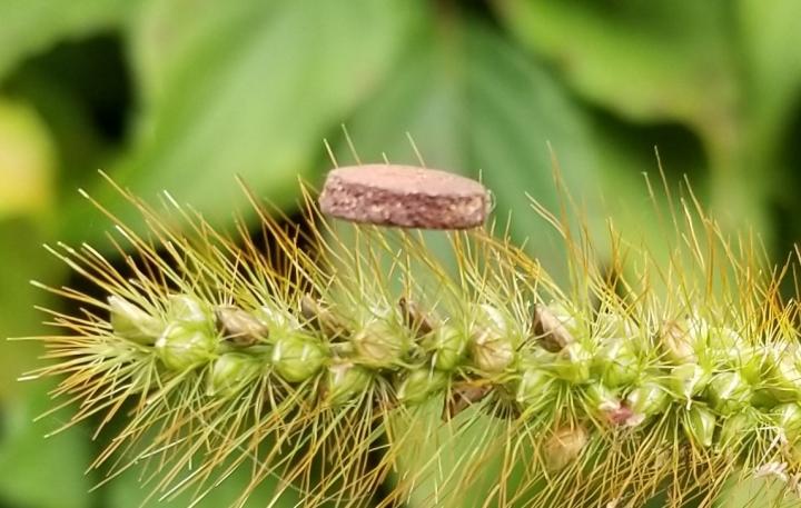 image: A copper-based foam filter that could someday be used in facemasks or air cleaners sits on the bristles of a plant, illustrating its light-weight nature.