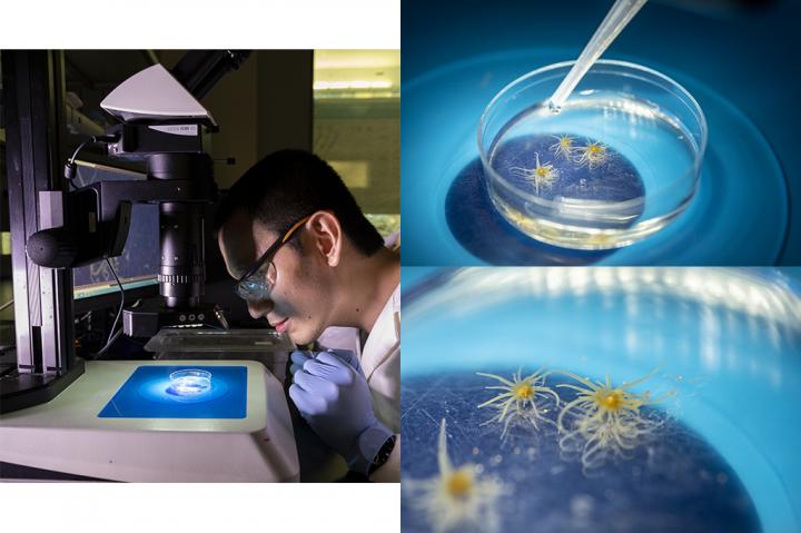 image: Guoxin Cui looks at the anemone Aiptasia, which is often used as a model for reef-building corals.