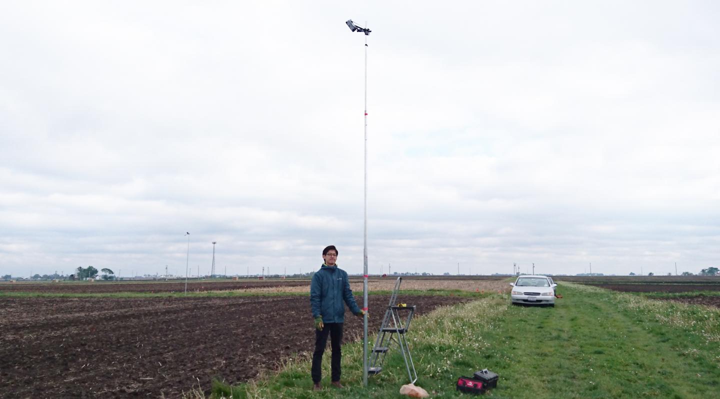 image: University of Illinois doctoral student Hyungsuk Kimm set up a network of cameras in corn fields around Illinois to ground-truth satellite-based algorithms to monitor corn productivity in real time.