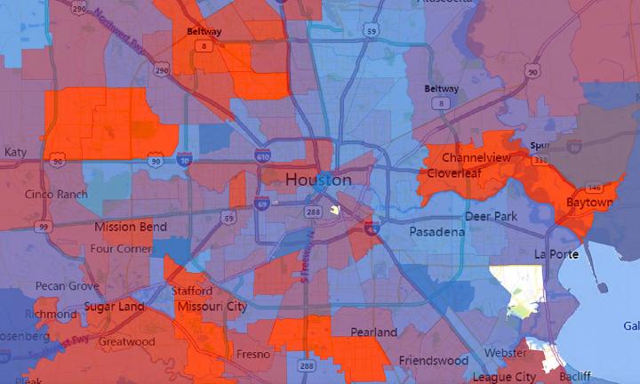 image: The number of virus strains present in each zip code in Houston during the second wave of COVID-19 cases in summer 2020. Number of strains is represented by a spectrum of colors from blue (0 strains) to red (50 strains). Credit: Houston Methodist/University of Texas at Austin.