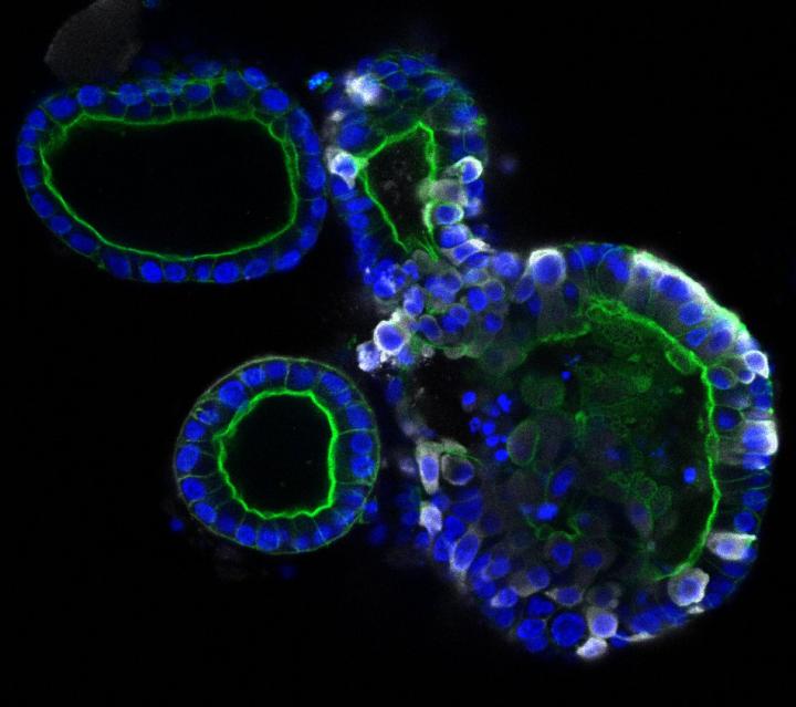 image: Intestinal organoids, the right one infected with coronavirus SARS-CoV-2. The coronavirus is colored white, the organoids themselves are colored blue and green.